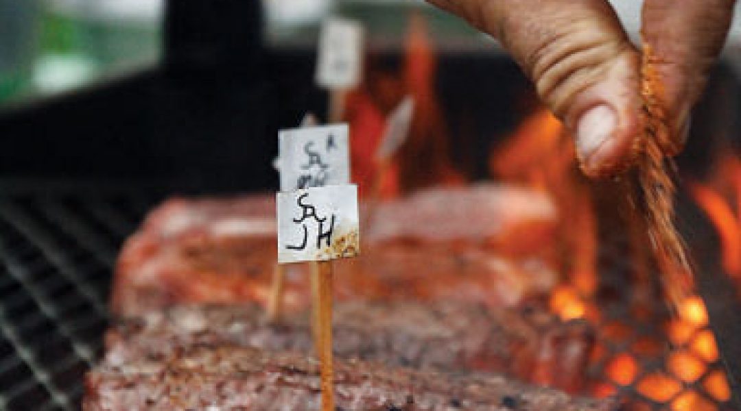 “Make sure your arm reaches just half the length of the grill, so you don’t singe all of it off,” Ostini quips. Next, he reviews essential tools for any grilling craftsman worth his garlic salt: stainless steel tongs (“I don’t like forks as much because they puncture the meat”); a basting mop (“Nothing fancy — you can even use a regular non-nylon paintbrush, but try to find China bristle”); a good wire brush and perforated pan; a “Santa Maria-style” ironwork wood grill, which has an open design and an adjustable grate that can be raised or lowered with a hand crank or wheel (“You can get them at Costco these days”); and for the griller, a nice glass of locally made wine.
