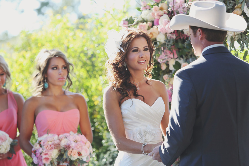 That same description could be applied to the wedding party’s attire. Bridesmaids wore coral dresses and delicate turquoise jewelry paired with brown custom-made Corral boots, complete with each person’s initials on the pull-tabs. The groomsmen wore black custom Corrals, as did the groom. (Corral is a sponsor of Durfey’s.) And as for the bride? Her boots were threaded with blue, and on the bottom of each sole was written “I” and “DO,” respectively. “I figured, why not go completely over the top?” Fisher says with a laugh.