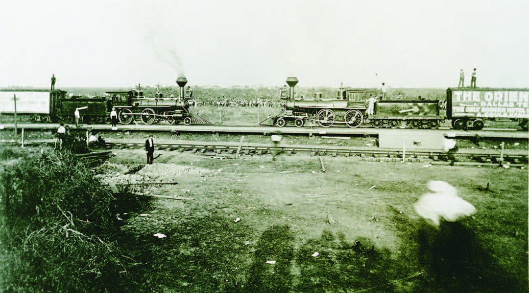 He envisions a staged train collision between two 30-ton steam engines, barreling toward each other at nearly 50 mph and meeting in a glorious explosion of fire and sparks. Crush suggests that the Katy railroad company invite all Texans to witness the historic event.