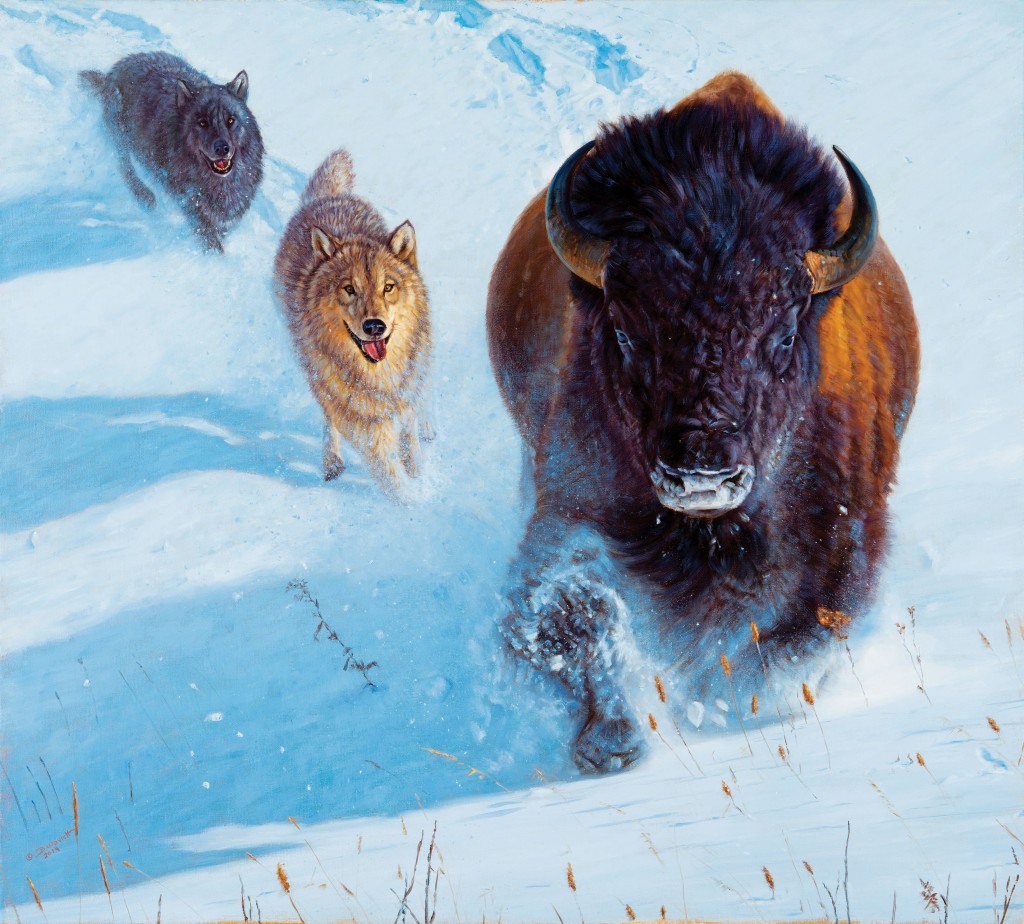 “The Yellowstone ecosystem and Ted Turner’s Flying D Ranch are two of the few places you can still find big herds of pure-strain North American bison,” the artist says. “I found places on Ted Turner’s ranch and positioned myself where bison would come down through the deep snow — sometimes right at me. Bison are designed to plow through snow like no other animal. They can survive in almost any environment, but the way they move in the deep snow fascinates me.”