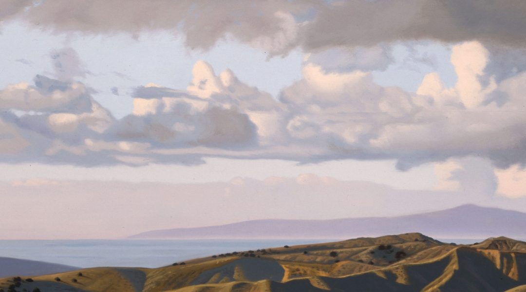A copse of trees, grazing horses, verdant hills, distant mountains, shining sea. It’s a classic notion of landscape perfection. The particular scene portrayed in the painting Landscape with a Red Pony is the actual view from the house and studio of American contemporary realist David Ligare. “The location of the painted view is Corral de Tierra in Monterey County [California],” Ligare says. “It is the area that John Steinbeck called ‘the pastures of heaven’ in his book of the same name. The writings of Steinbeck and also the poet Robinson Jeffers were part of the inspiration for me to live and work in this beautiful place. It is a literate landscape.”