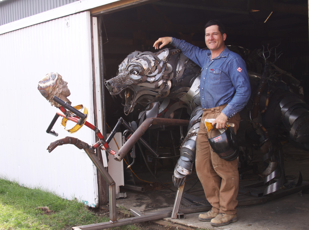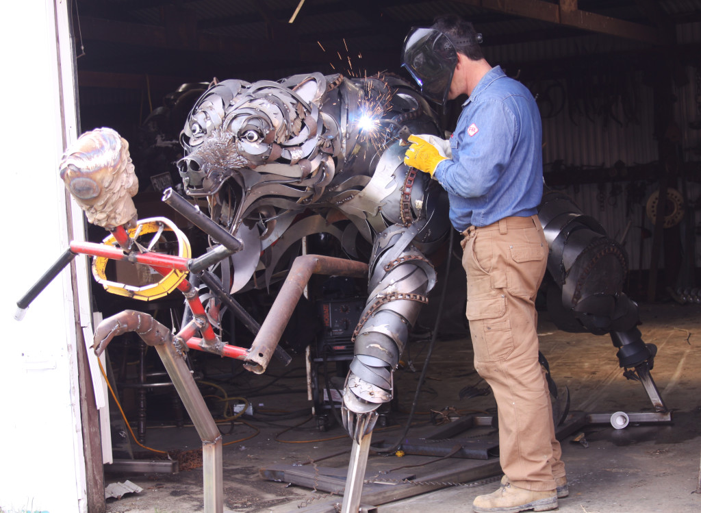 Artist John Lopez figured there was no better way to depict a bear mauling than with a 3-D collage of scrap metal.