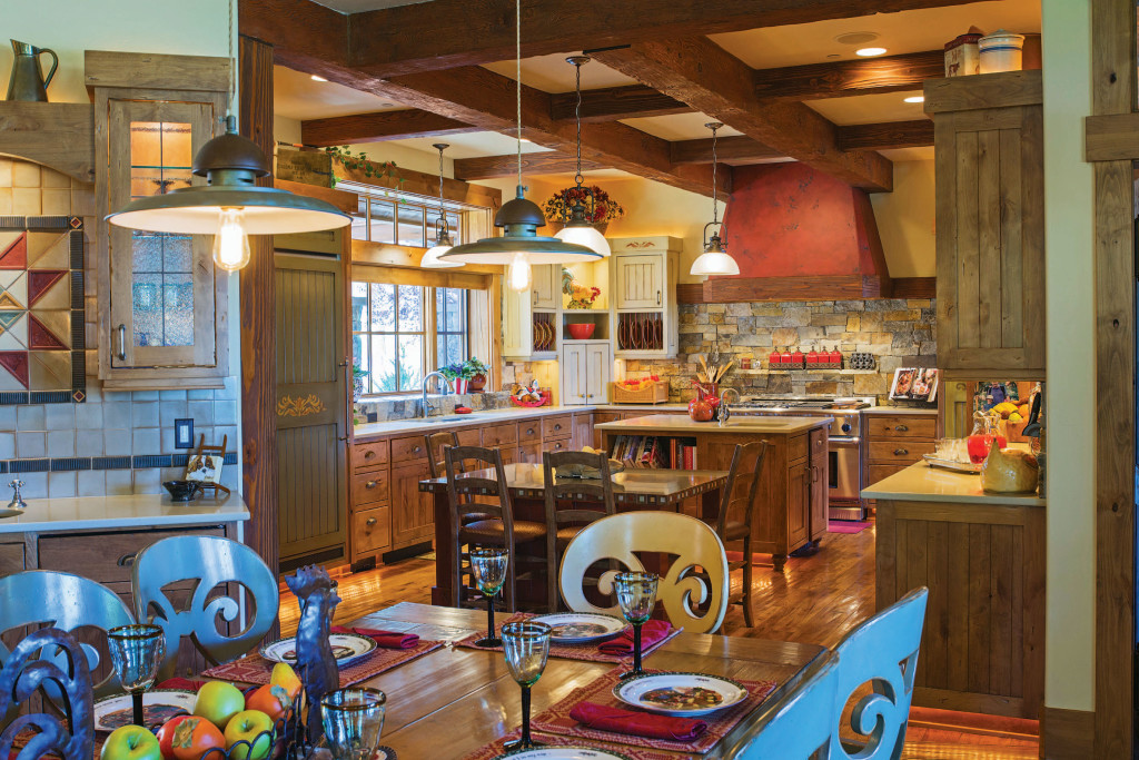 “Old-time cabins commonly had an inner core — a kind of cabin within a cabin, such as a kitchen and hearth area,” says Pattie. “We wanted to re-create that experience in a more modern way.” So after acquiring Black Diamond Ranch, the couple turned to Jim Norman and Greg Garrick of Norman Building & Design for help with the execution. “Norman Building had an outstanding reputation,” says Craig. “They offered a one-stop construction solution that included creating plans, providing interior design services, and custom cabinetry fabrication.”