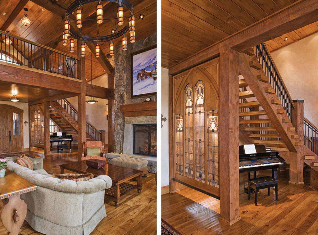 The exterior of the home features heavy wooden trusses, timbered siding, and natural quarried rock. An arched beam supporting the portico is echoed in the arched frame of the front door. Antique stained glass windows reclaimed from an old church were fitted on both sides of the heavy door, hinting at the experience within.