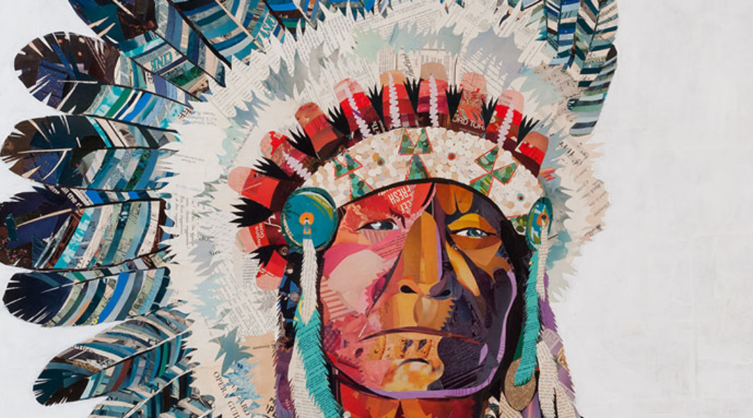 Despite his unorthodox materials, nothing Geiman does is haphazard. Consider his commanding portrait Chief (Bison Head) which was created exclusively out of items gleaned from Oklahoma and Texas, the territory where the collaged chief might have lived. “His shirt is made out of early 1900s corn advertisements I found in a barn, pages of music I found in an abandoned saloon make up the feathers, and maps are what I used to create the texture in his face,” Geiman says.