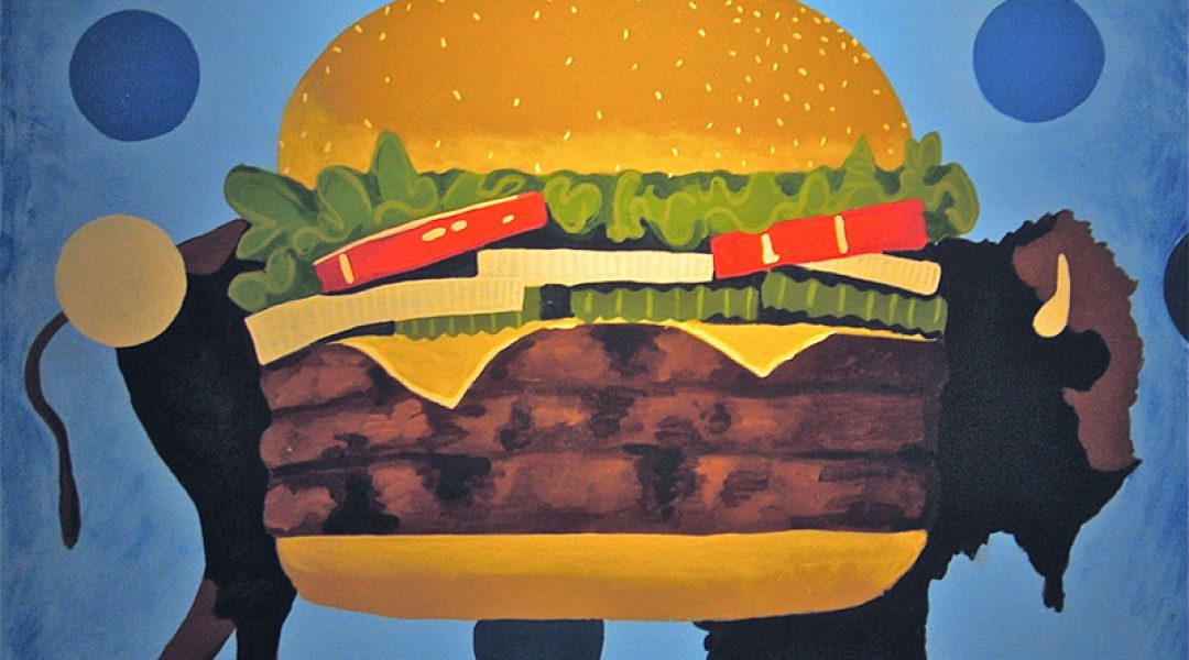 One painting included in the show portrays Buffalo Bill with a plate of Buffalo wings flanked by the Buffalo Bills logo. Despite painting Buffalo Bill multiple times, Buffalo Hyde is not a fan of the historic showman, whom he sees as something of a victimizer (“If you really look at it, he was basically an opportunist and made a living sort of dehumanizing people”); the beast, on the other hand, comes across as a victim of both massacre and marketing. “I was commenting on how the buffalo is a powerful icon not only for Native Americans but also for popular culture,” says Buffalo Hyde.