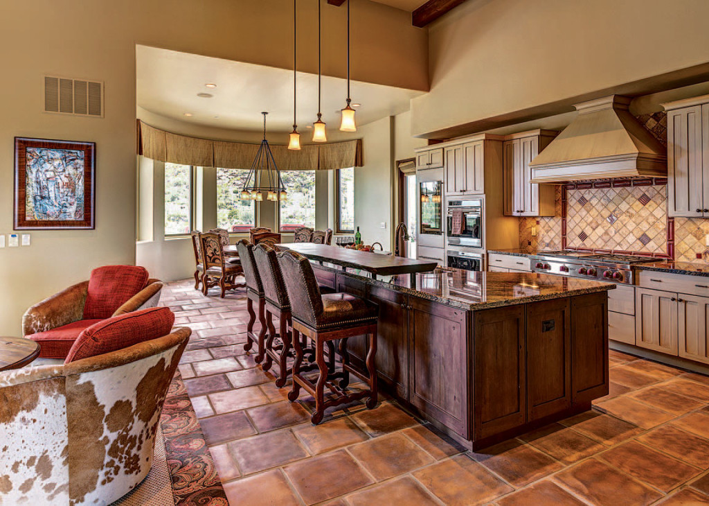 Building and finishing out the home was a nine-month undertaking. For help achieving a polished look for their 3,200-square-foot three-bedroom (plus den) home, the Holways were referred to local interior designer Liz Ryan, who had also worked on five other residences the couple had toured. To flesh out an overall design concept, Karen tore pages out of magazines for inspiration, including a favorite one of a Southwestern-style adobe fireplace. “They wanted a casual elegance, with a sense of rustic, regional influence,” Ryan says. They chose a calm palette of sand tones and hints of rich reds, a mix of custom-designed furniture, wall coverings and window treatments, and hand-selected artwork and sculpture culled from local galleries Wilde Meyer Gallery and Jane Hamilton Fine Art.