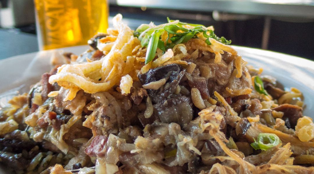 In a large shallow pot, sauté the diced bacon until golden in color. Add garlic and rosemary and sauté until garlic starts to gain some color. Add sliced shallots, minced onion and mushrooms to bacon mix and sauté until caramelized. Deglaze the pan with the red wine until liquid is reduced by half.