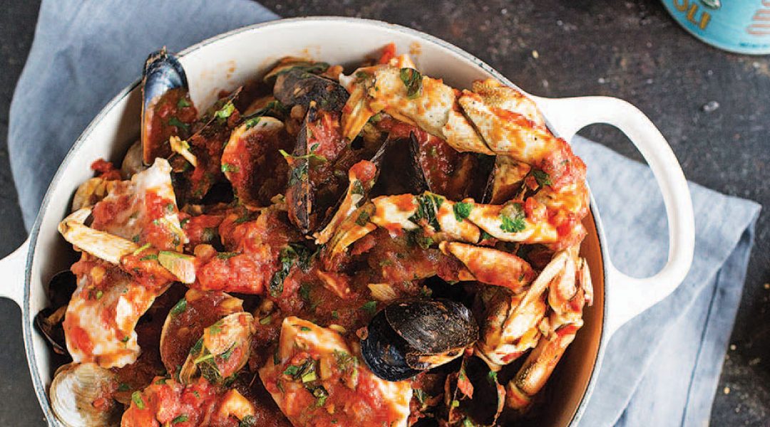 A fish stew with Mediterranean flair, cioppino (cho-pea-no) been around since the days when Italian and Portuguese fishermen settled in the Bay Area during the Gold Rush era. They’d bring home leftovers of what they’d made onboard; restaurants created their own variations of the spicy wine-laced tomato-based soup, and the dish took off.
