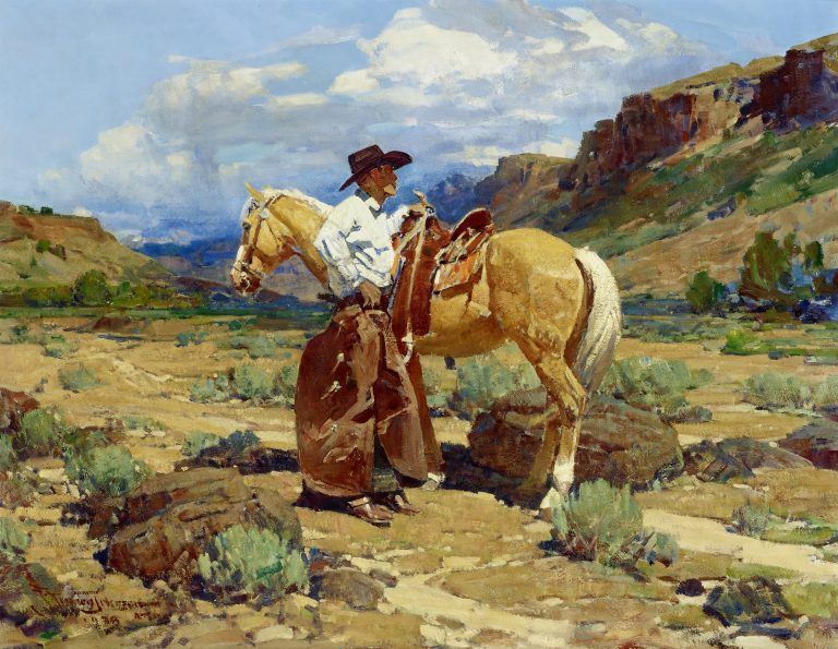 This detailed dive into the West is also reflected in the work of Frank Tenney Johnson (1874-1939), particularly Rim Rock Wrangler which was sold for $315,375 and An Idle Dreamer which was sold for $239,775. Both depicting a solitary cowboy and his horse, these two pieces reflect solitude on the Western range in a sympathetic and romantic light.