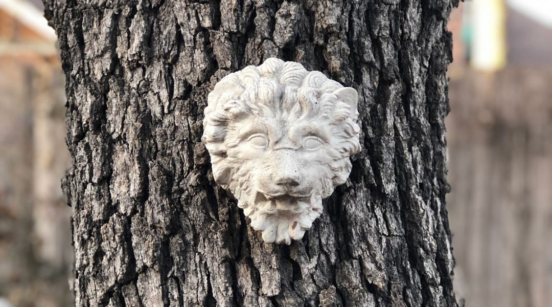 We buried Slippy under potted yucca plants beneath a tall spreading oak tree that has a small stone sculpture of a lion’s head nailed to it. The great cat looks like he’s roaring, in the prime of his life, his full mane blowing in an imperceptible wind.