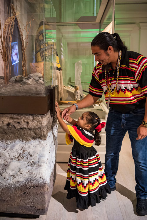 The curators wanted to show visitors “that Native people [are] still here, and that these traditional teachings and art forms are being passed down today,” adds Her Many Horses, an associate curator at the National Museum of the American Indian. “People are still creating, but they have new materials.” To drive that point home, the immersive experience includes interactive storytelling installations that allow further exploration of the art, artifacts, and history, with narration and insights provided by some of the artists.
