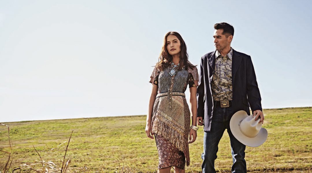 On Him: Miles hat with buffalo coin band by Resistol. Whiskey suede blazer from Overland. Wrangler Retro olive snap shirt and jeans by Wrangler. Custom Indian chief tri-color buckle The Bohlin Company. Brown leather belt by Vogt. On Her: Ryan Michael printed denim shirt from Spunky Steer. Multi-tiered ruffle skirt by Scully. Naja pendant necklace and mother-of-pearl ring from Peyote Bird Jewelry. Turquoise and shell bead necklace with butterfly concho pendant from Nathalie. Freedom turquoise and mother-of-pearl necklace from Sweetbird Studio. White Buffalo and Dry Creek turquoise cuff from High Plains Jewelry.
