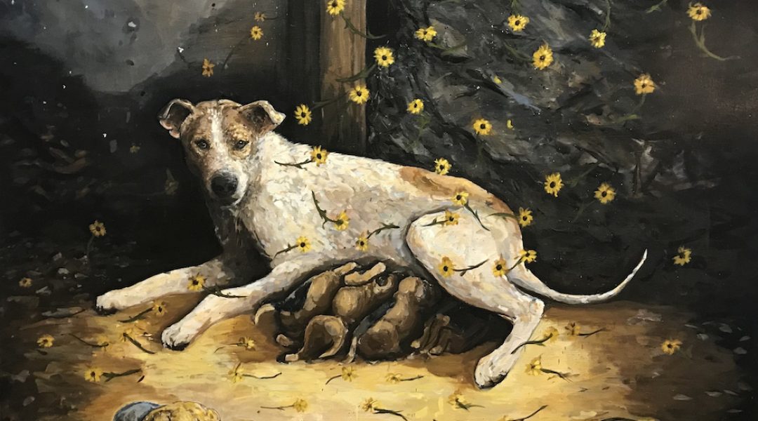 Rez Dog Mother and Puppies, 2019, acrylic on canvas, 60 inches by 66 inches.