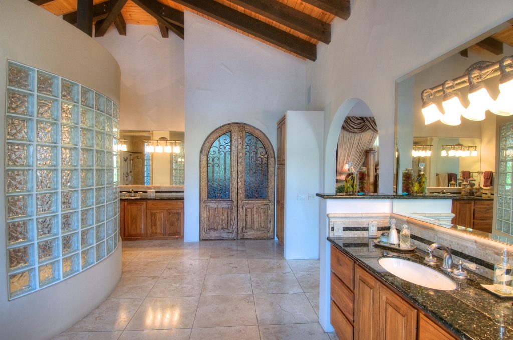 - High wood-beam ceilings and granite, travertine, and ceramic tile work throughout