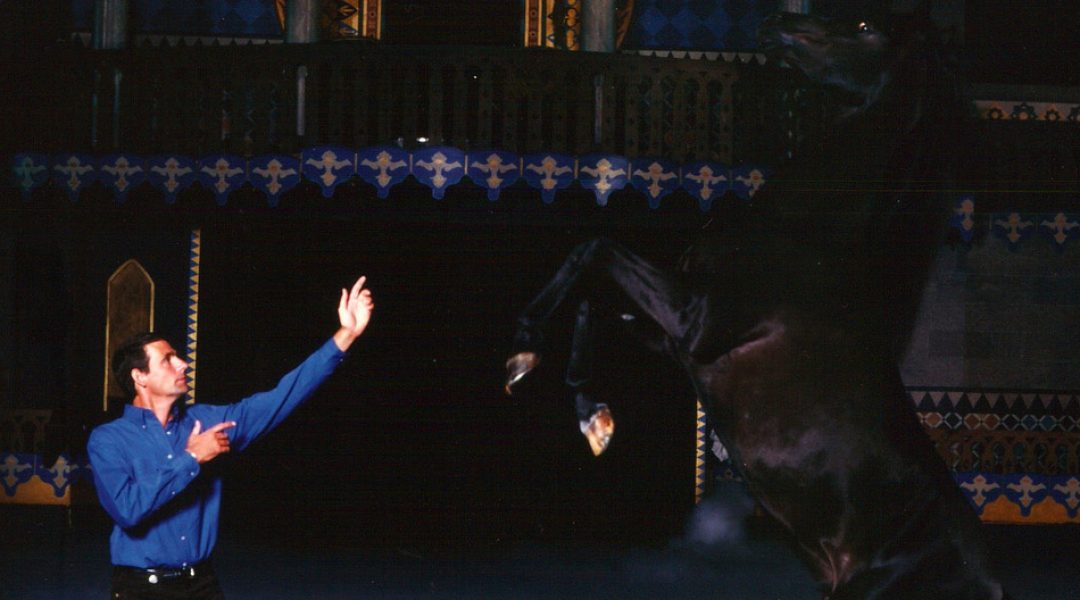 (Lead image) Tim Farley trying his hand at liberty work rearing the Black Stallion that starred in the long-running (now closed) Arabian Nights Dinner Attraction in Orlando. Walter Farley was close friends with the family and gave permission for the black stallion namesake to only be used there. Curious tidbit. Glenn Randall Sr. (Corky’s father) did the original horse training at Arabian Nights.