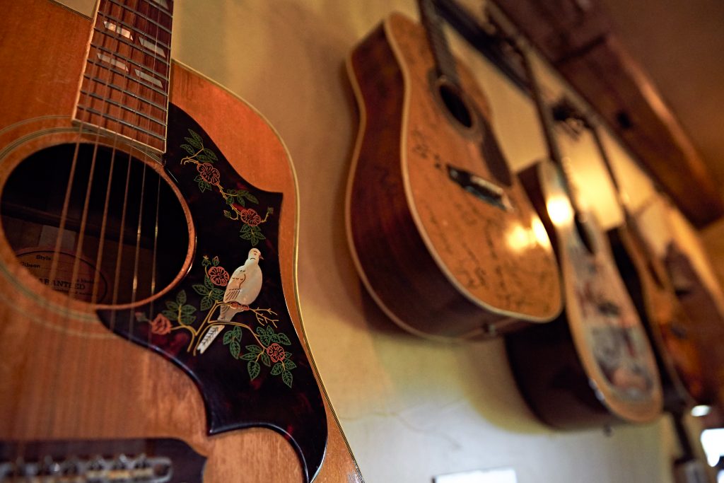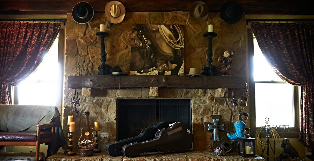 Inside, you can almost hear the echoes of the amazing parties that must have taken place here. In the dining room, an epic wooden table is surrounded by enough leather-bound chairs to seat 12. The walls of nearly every room are decked in amazing memorabilia. One side of the living room has nine acoustic guitars Randy has collected from various tours or special events. One is emblazoned with the faces of Willie Nelson and Merle Haggard, from a show they played in New Orleans. In a corner is a saddle that was somehow previously owned by both Henry Ford and Kareem Abdul-Jabbar. In a glass case next to the patio door is one of Charlie Daniels’ signed bows. There are photos of Randy with George Jones and Charley Pride. A black cowboy hat hanging behind one of the leather couches has a signed message in marker from Garth Brooks.