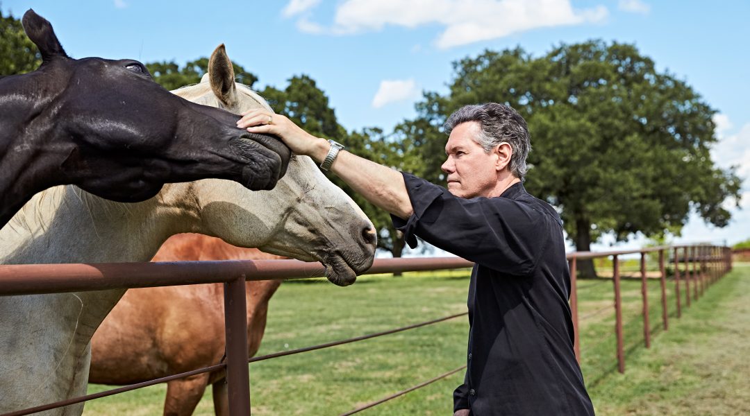 Driving through the gate of the ranch where Randy Travis lives, just outside Tioga, Texas — about 25 miles south of the Oklahoma border — feels like entering a private paradise from another time. A narrow paved road winds through acres of lush green pastures. There’s a paint horse frolicking to the right, three American bison dipping into a small pond on the left, a massive longhorn steer luxuriating in the sun down the fence line. The three-story main house is perched on a hill that overlooks the rest of the property.