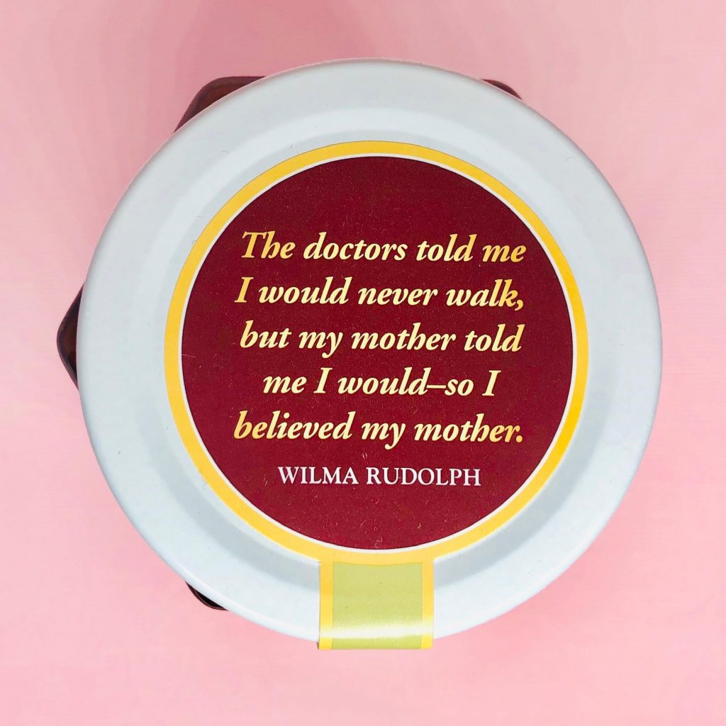 The name of the company and the philosophy behind it are something I relate to. As Lasher explains on the Somebody’s Mother website: “Generally speaking, mothers are almost never validated or recognized, much less compensated. They do it instinctively. They love instinctively and they make sacrifices on a daily basis. That’s the main reason we started using quotes about mothering, or parenting, on the jar lids of our products. We have 36 now and I love to see the jars askew on the shelf because I know that means someone is looking for just the right quote which, if not recognition, at least seems to give everyone a little chuckle.”