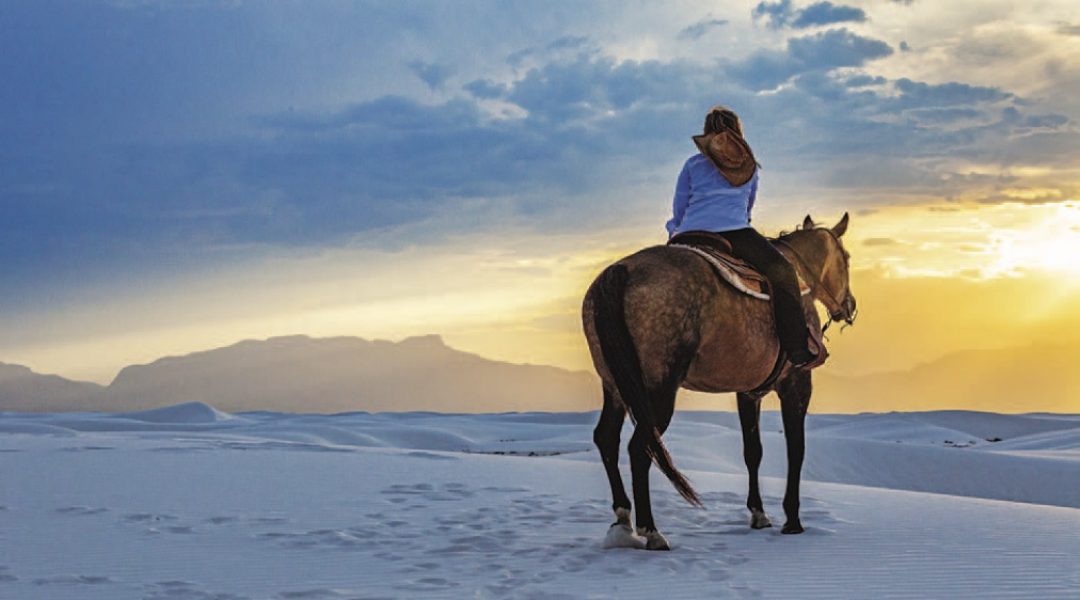 It was late March. I was on a Sunday morning horseback ride at the Rancho Encantado with the part-time wrangler who was mainly an architect. It had snowed the night before, just a few inches, and sparkling crystals of the stuff glittered on the mountains and arroyos of Tesuque, New Mexico, just north of Santa Fe, as we rode, brushing up against piñons and junipers. Cornflower blue skies and nothing else in sight. I was riding Sydney, a chunky little sorrel quarter horse with an easygoing temperament. The whole world seemed newly created: fresh, peaceful, hushed — just the crunch of our horses’ hooves and their quickened breaths after we loped them. I felt like anything was possible. “Spring snow,” offered the wrangler. “It’ll be gone by afternoon.”