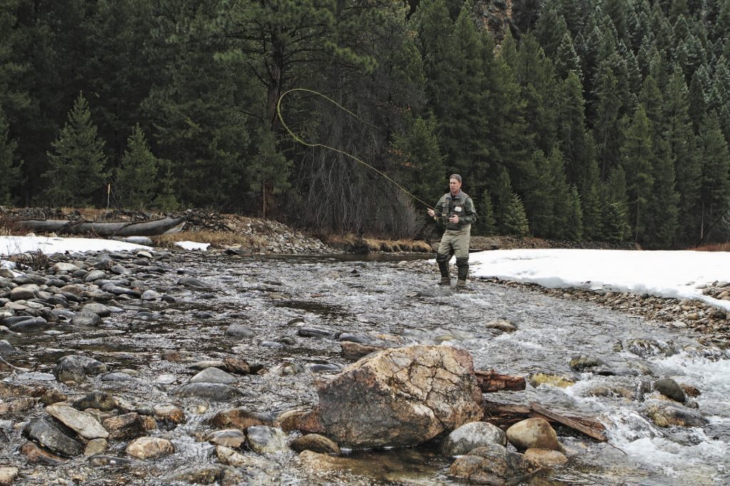 Sporting sunglasses, a Boston Red Sox hat, and a salt-and-pepper goatee, Boomer picked me up at Triple Creek Ranch for the short drive to the Bitterroot River. Snow-draped mountains surrounded us. To our right, parallel to the highway, the river crawled through rocks and snow. Sometimes it was only a few feet wide, sometimes 20. Steering with his left hand, Boomer used his right to wave at the beauty. “This is my office,” he said. “The interior decorator did a great job.”