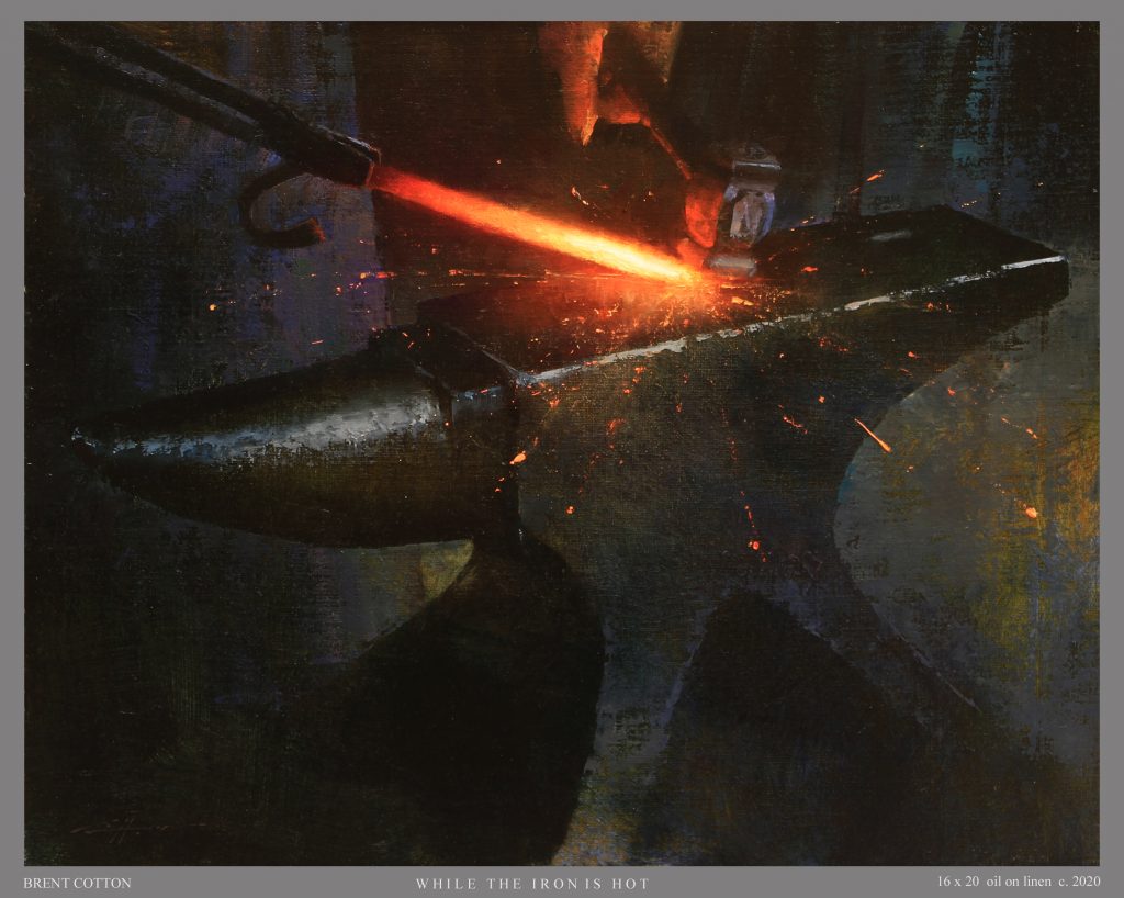 Montana’s Bitterroot Valley is the focus of Cotton’s entries for one of his favorite art shows, the Briscoe Western Art Museum’s Night of Artists. The big event along San Antonio’s River Walk has been drawing top-flight artists for two decades. “For me it’s a relatively new show,” Cotton says. “I think last year was my third year.” It was a bummer, he says, that Night of Artists had to be virtual last year because of the pandemic; even so, he made a splash at it, winning both the David Crockett Award for Artists’ Choice with Search Party and the William B. Travis Award for Patrons’ Award with Strike While the Iron Is Hot.