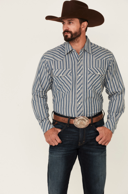 Hat: 40X 4 1/2 DRK LO ($519.95), besthatstore.com; Scarf: Paisley Silk Wild Rag Scarf ($39.99), nrsworld.com; Shirt: Blue Wylie Stripe Long Sleeve Snap Western Shirt ($39.99), sheplers.com; Jacket: RangeWax® Summit Jacket ($225), schaeferoutfitter.com; Jeans: Cowboy Cut Original Fit Jean ($49), wrangler.com; Boots: Tan Rough Out and Arizona Tan Wide Square Toe Western Boots ($249.99), cavenders.com