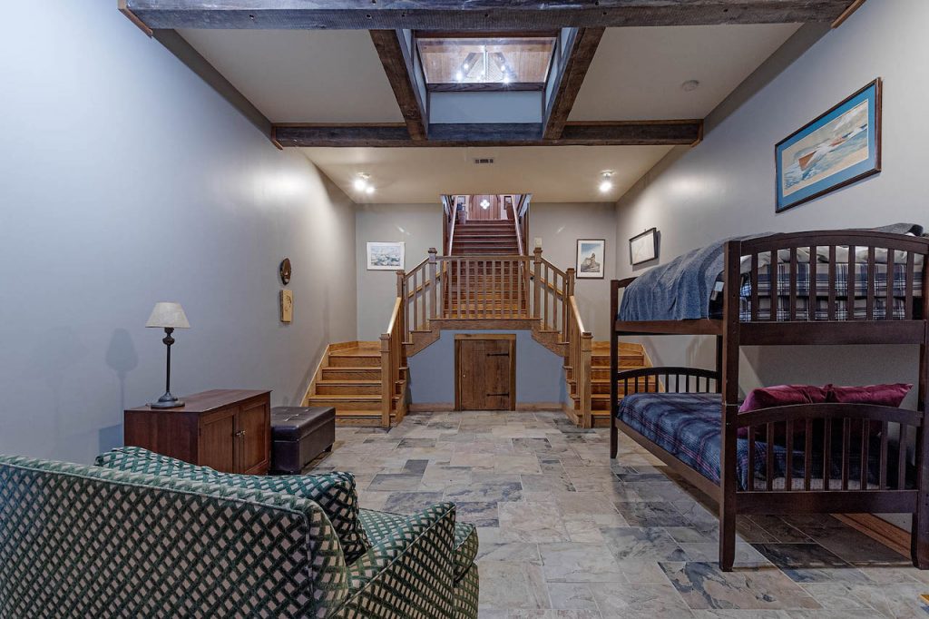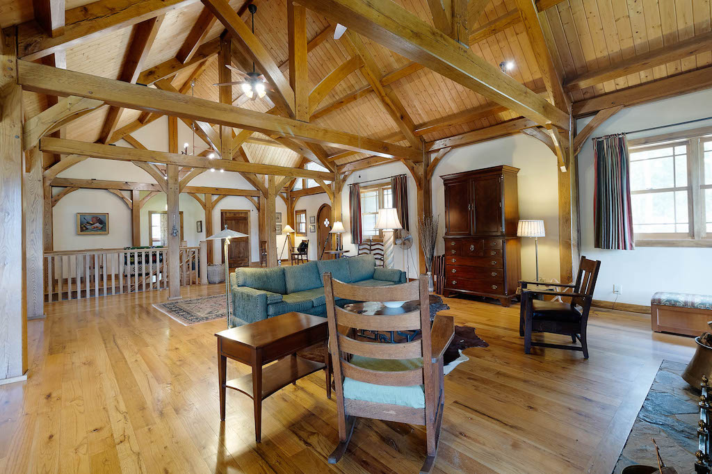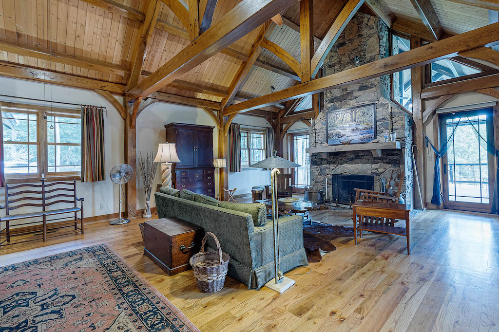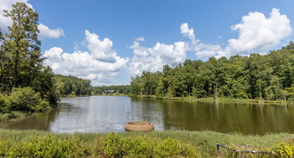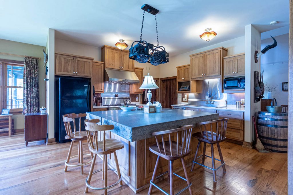 The 6,170-square-foot house sits on the northeast side of a 14.5-acre lake and was designed, sourced, and constructed to reduce environmental impacts. A significant amount of wood and stone was pulled from what is now the lake bottom, kiln-dried, and used throughout the house, including the red and white oak floors, cupola ceiling beams, poplar interior doors, and a grand stone fireplace.
