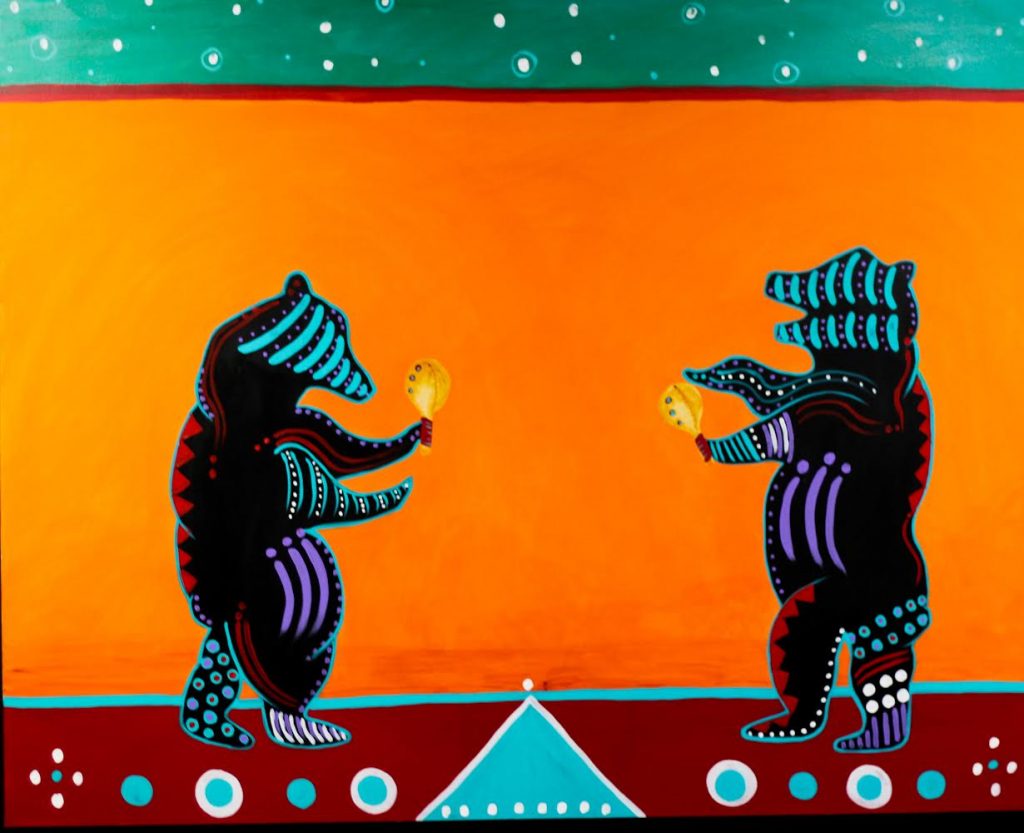 Neepin Auger (Creek), Medicine Spirit Dancers, acrylic on canvas, 40” x 60”. Photo credit: Courtesy of the artist