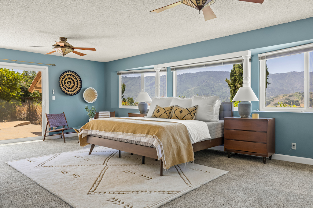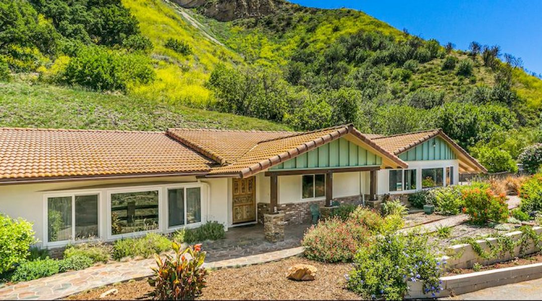 The property also includes five bedrooms, a pool, office, and barbecue area, not to mention sweeping views of the Ojai Valley, oak trees, evergreens, and year-round flowers.