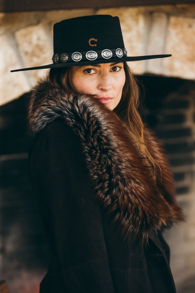 High Desert felt hat ($140), charlie1horsehats.com; Alicia suede coat with fox fur trim ($995), overland.com; Cashmere button-up dress ($4,995), maloufontheplaza.com; Vintage Sandcast and turquoise concho belt ($1,500), westerntradingpost.com; Southwestern black wristlet clutch ($39), objectsofbeauty.com; Lidia Vesuvio black boots ($670), oldgringoboots.com.