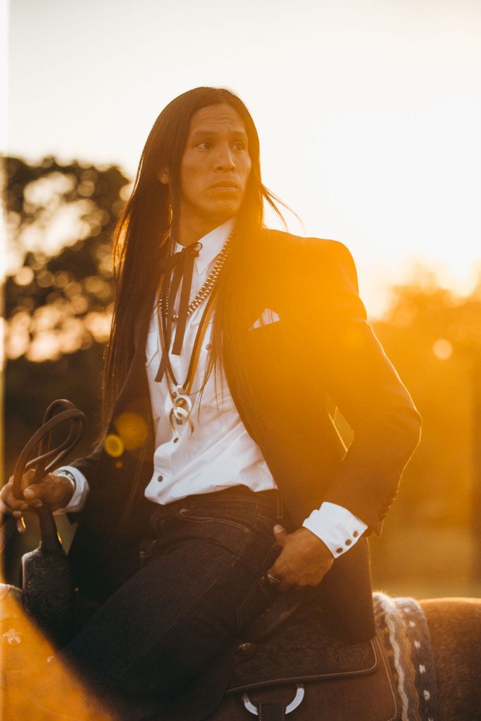 Roy Tracy (Diné) Navajo pearl beaded necklaces, 2 Navajo Naja pendants on latigo leather straps (custom made), Instagram: @roytracynavajojewelry; Custom tux jacket (contact for pricing), leddys.com; White button-up shirt (C&I’s own); Kimes jeans (C&I’s own).