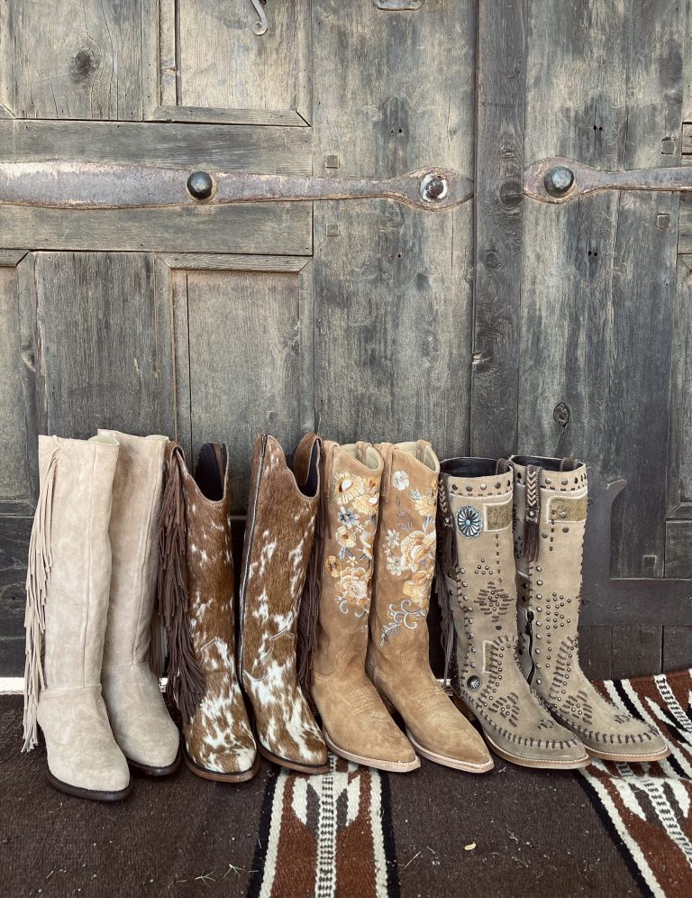 Left (left to right): Stetson Dani suede boots ($330), maverickwesternwear.com; Elora hair-on-hide Liberty Black boots ($480), paintedcowgirlwesternstore.com; Stetson June suede boots ($295), maverickwesternwear.com; Double D Ranch Desert Chuks boots ($819), maverickwesternwear.com.