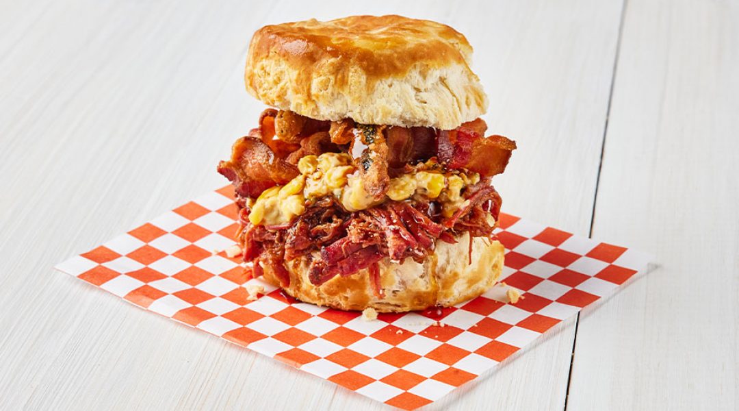 The Holy Biscuit — We’ve got a biscuit sandwich consisting of layered shredded brisket, fire-roasted street corn queso, and thick-cut bacon drizzled with Texas hot honey.