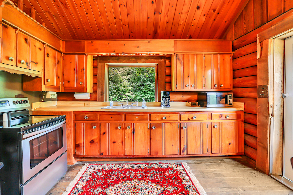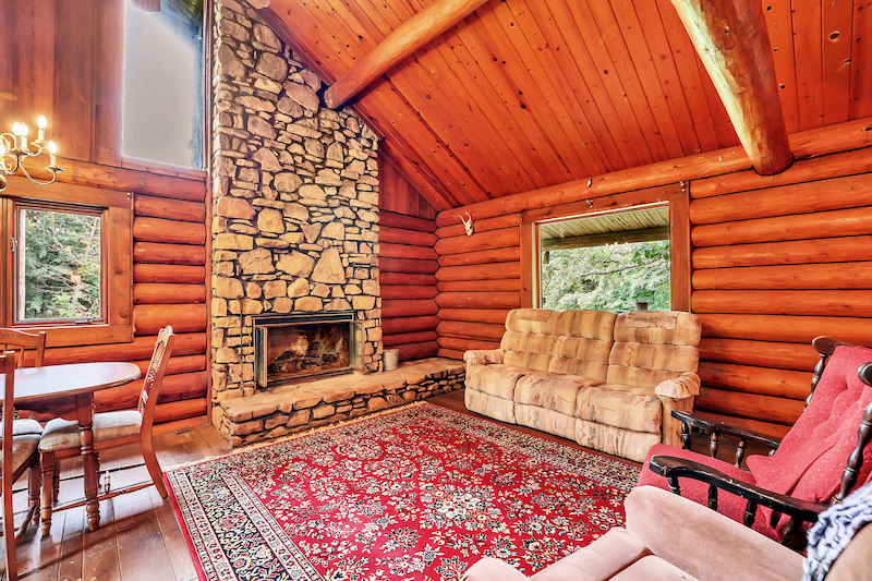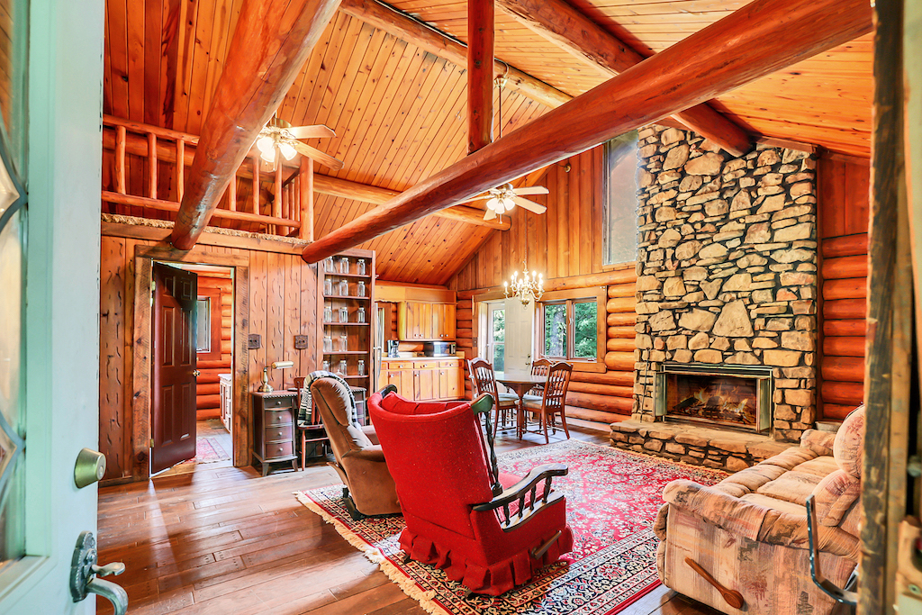 A barn is near the entrance to the property, and guests follow a meandering mile to the front door. A fireplace in the living room cuts the winter chill, and a homey, eat-in kitchen beckons guests to gather around the table. There are two bedrooms and a third loft-style room overlooking the living area.