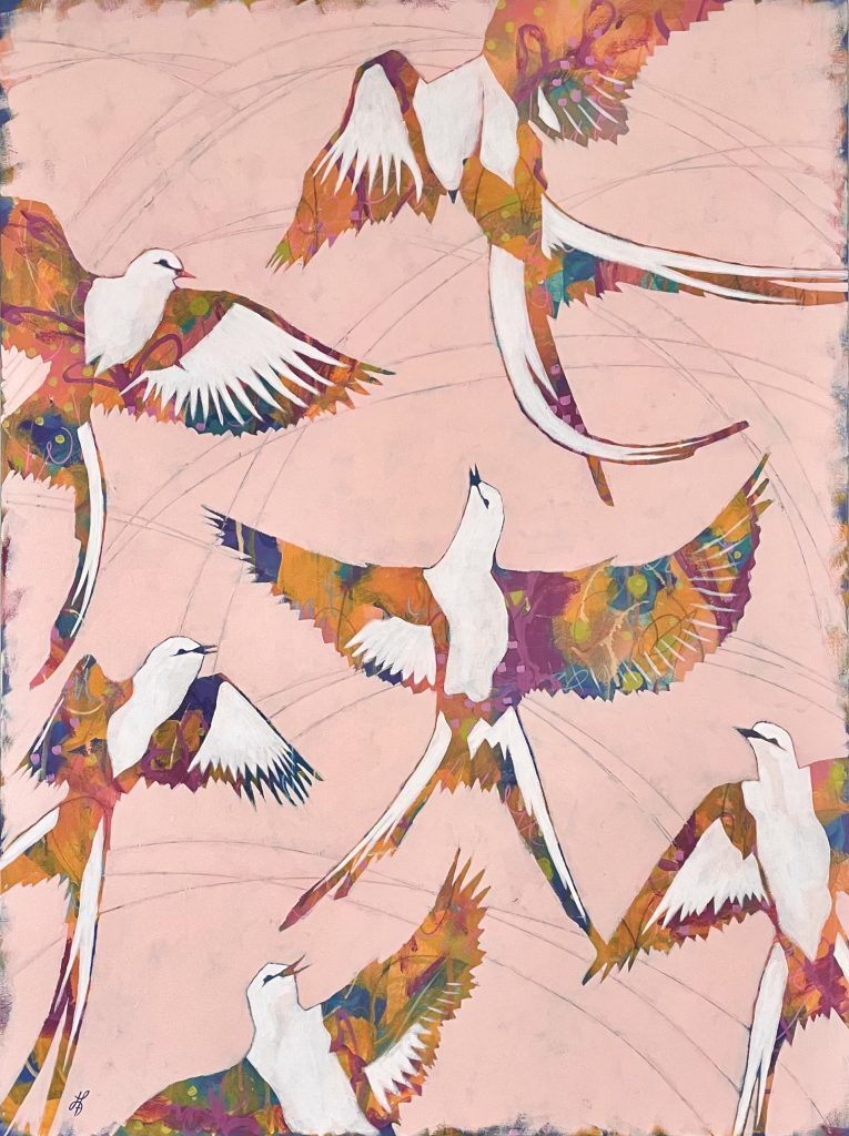 “I start with an idea of shapes and a narrative and the figures I want to use, and then with a color scheme,” she says from her basement studio in her home in Oklahoma City’s historic Crown Heights neighborhood. “I usually stick to a plan, and sometimes I realize some colors won’t work together. The initial layer never goes according to plan. I start with an idea, and then I have to respond to what’s on the canvas.”