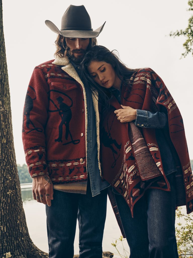 Western motifs such as colorful patterns inspired by the iconography and optimism of the cowboy spirit are definitely prevalent in this new collection of men's and women's apparel. Sherpa jackets, soft hoodies, graphic tees, and a signature luxury wool blanket woven with a roping cowboy motif make up this nod to the Western legacy of both legendary brands. And, of course, what would a Wrangler collection be without a pair of classic jeans?