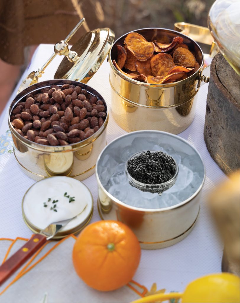 Hosting a sundowner makes my job as a host easy, because all I have to do is provide the food and drink ... Mother Nature supplies the rest of the ambience. Sunsets have transfixed everyone from Claude Monet (who painted them again and again, determined to capture their mystical light) to Neil Young (who crooned about the land of beauty, space, and light in his song "California Sunset"). Don't they deserve a toast? So early last autumn, we toted leather camp chairs, armfuls of freshly cut sunflowers, and addictive nibbles and drinks into the fields below the 13,775-foot-high Tetons, including sweet potato chips with caviar and creme fraiche, and Turmeric Gin and Ginger Mules that glowed like the setting sun. It was so simple — just sitting out there together, watching the sun go down — and yet it couldn't have been more magical.