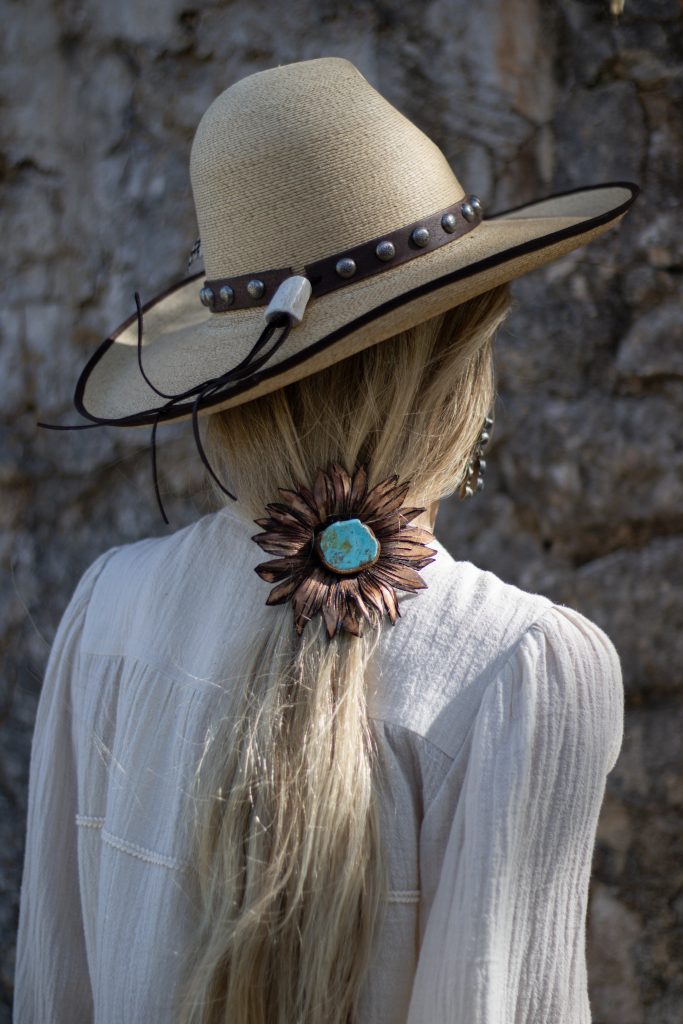 [2] Elsa Gus Palm Hat ($255), lauraingallsdesigns.com; Kingman Turquoise Leather Sunflower hatband ($250), caseycurtisdesigns.com.