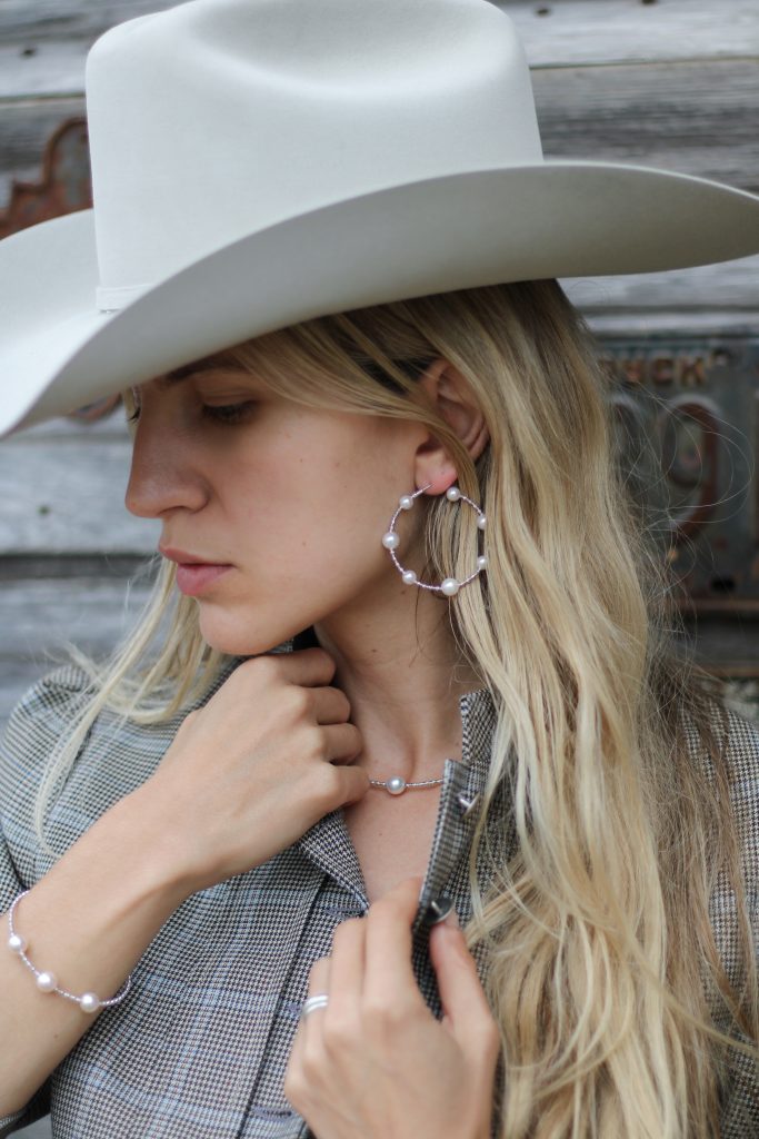 [1] Resistol 20X Silverbelly hat ($470), resistol.com; Multi-Pearl Sparkle Bangle Hoop 18K Faceted Bold earrings ($1,800), Petite Akoya Pearl 18K Faceted Gold choker ($3,600), Petite Multi-Akaya pearl Open Sparkle 18K Faceted Gold Bangle ($2,495), pearlsbyshari.com.