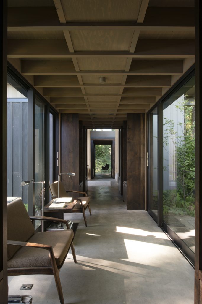 Olson's dedication to using the same simple materials — things like concrete, plywood, and recycled boards — for all the structures throughout the years also contributes to the seamless connect between rooms and helps keep the focus on the views. He also gives a nod to the "magic window," which goes a long way toward bringing the outside in. "A magic window is one where the edges of the glass are hidden from view, thus rendering the whole window basically unseen — like magic," Olson says. "It blurs the boundaries between nature and the build environment to connect you to the larger landscape. At the end of the bedroom hallway, for example, the glass disappears through a vista looking out into the woods, giving the illusion that you are outside in nature. It's the perfect actualization of prospect-refuge."
