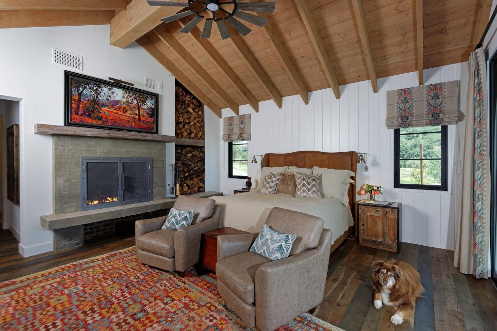 The master suite with its wood-burning fireplace and free-standing copper tub offer both elegance and comfort in this rustic setting.