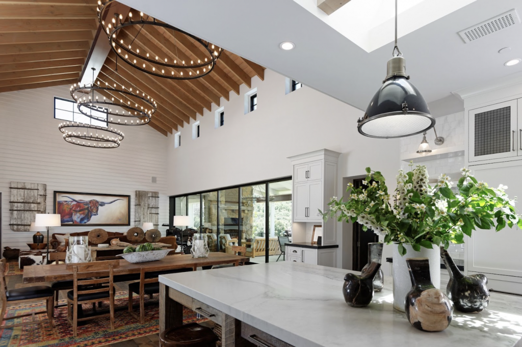 The ranch’s charming main residence is a 6,500 square foot farmhouse situated at the heart of the 100-acre property. Its design artfully marries modern elegance with the timeless essence of the Western classic style.