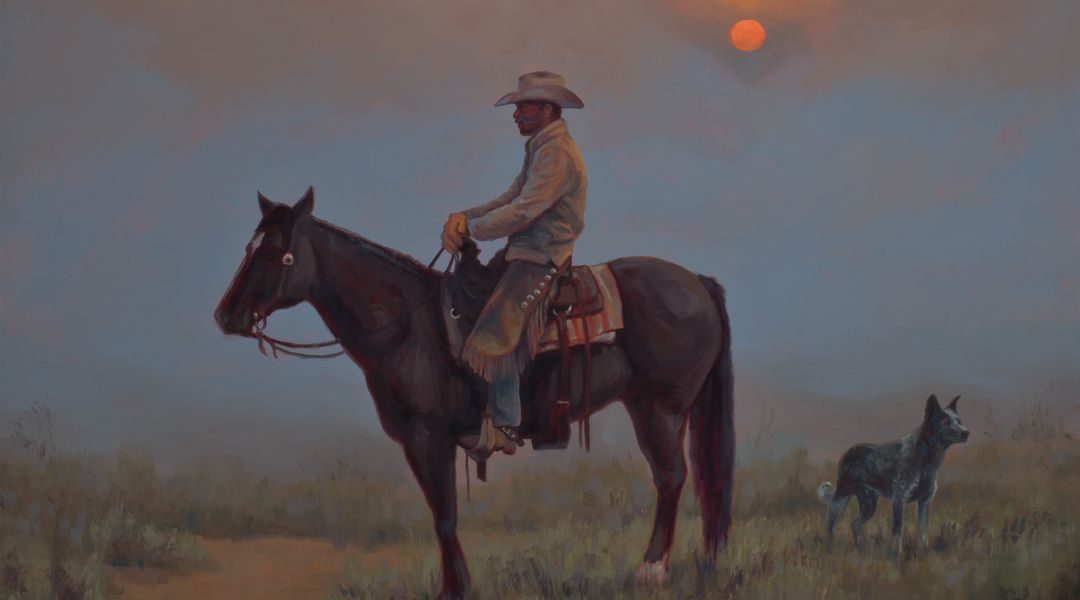 Instead of a historical scene of an Old West stampede, he paints an image of a grizzled cowboy with a cigarette dangling from his finger, standing at a bar next to a younger man holding a cell phone. The older man’s eyeing the other suspiciously, but it’s unclear which one has strayed into the other’s environment.