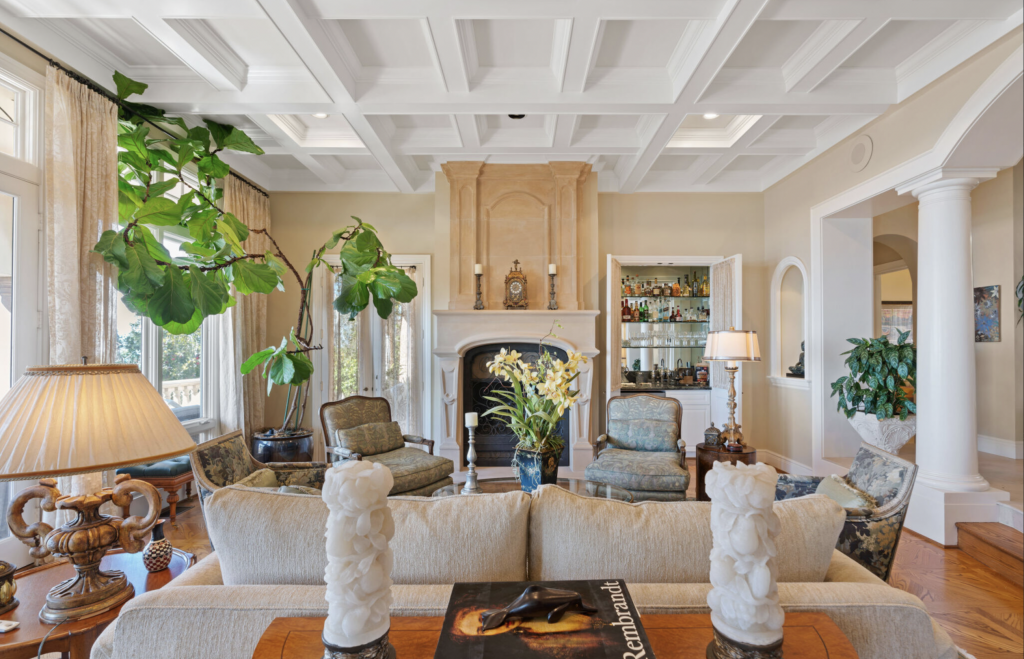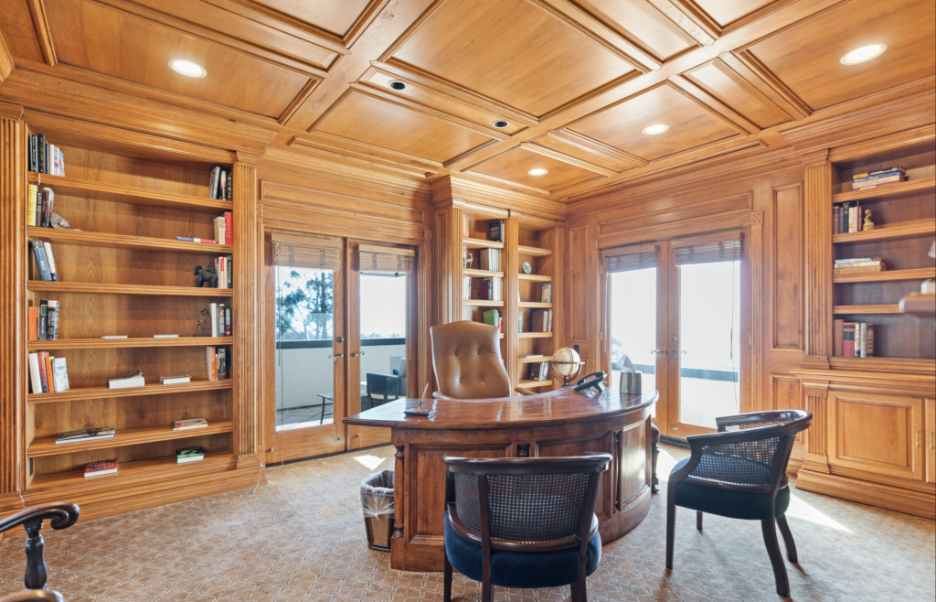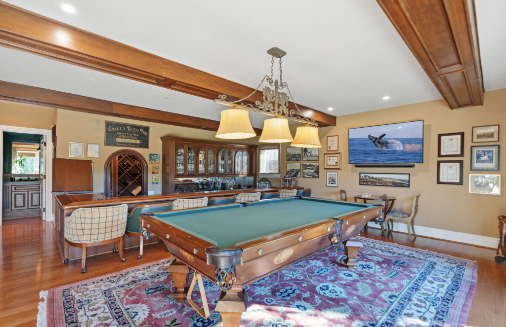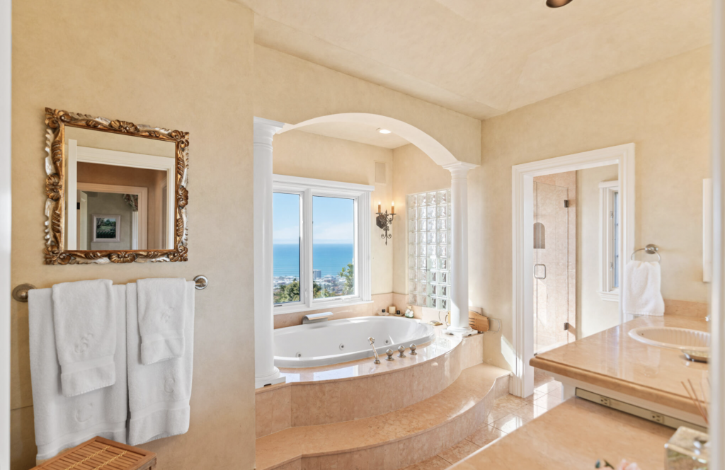If serenity is the main purpose of your sojourn out west, you’ll want to call dibs on the restorative primary suite. There you’ll find a variety of sitting areas, a lovely fireplace, and French doors that open to a private balcony with ocean views. Unwind in the spa-like en suite bathrooms that are complete with a jetted tub, custom walk-in closets, bespoke shoe room, and two home offices. The home’s fully equipped home gym, private pub with billiards room and temperature-controlled wine cellar, and lush backyard with an in-ground jacuzzi will also go a long way in making you feel like a million — make that a billion — bucks.