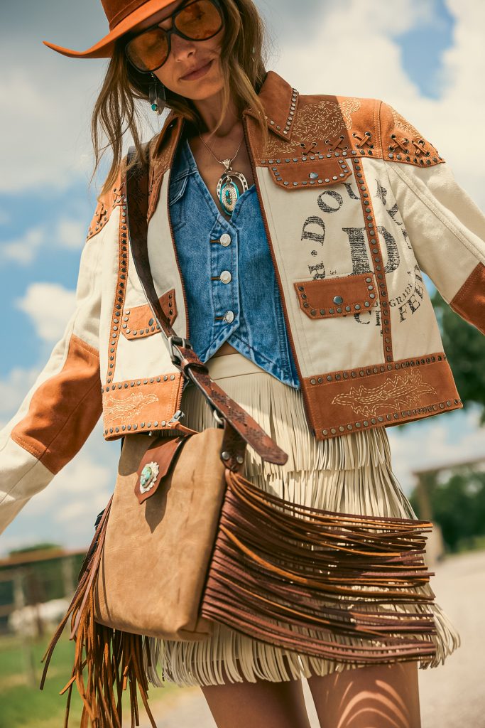 Brick felt hat, resistol.com; Sundance sunglasses, americanbonfire.com; Ben Nighthorse (Navajo) concho and horseshoe pendant necklace, sorrelsky.com; Single stone feather earrings and Royston turquoise ring, hippiecowgirlcouture.com; Etkie Cara glass bead cuff, jewelryladyredriver.com; Jackson Hole denim vest, shopthreesons.com; Rollin’ Rollin’ Rollin’ jacket, doubledranch.com; Fringe Falls mini leather skirt, tuckerbrown1986.com; Flying Arrow fringe crossbody, ridefreemontana.com; Maggie metallic shorty boots, mironcrosby.com.