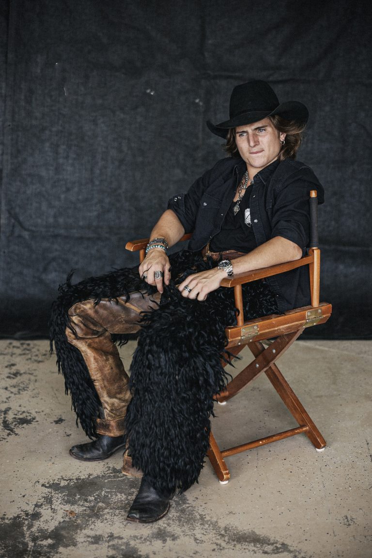 Rank 45 t-shirt and jeans, bootbarn.com; Barstow Western denim shirt in marble black, levi.com; Custom jewelry, rideranksilver.com; Turquoise cuff, hippiecowgirlcouture.com; Custom belt, carmenallen.com; Antique wooly chaps, westerntradingpost.com; Black felt hat, David Yurman jewelry, belt buckle, and boots (Rocker’s own).