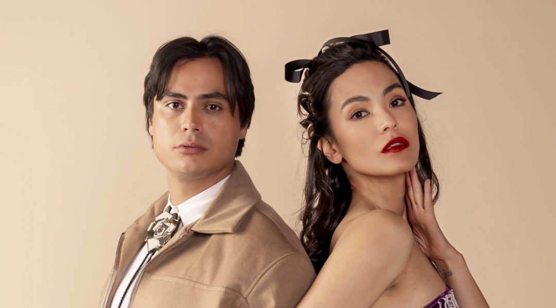 Kiowa Gordon (left) and Jessica Matten (left) pose in garments by Lesley Hampton at the 2024 SWAIA Native Fashion Week.