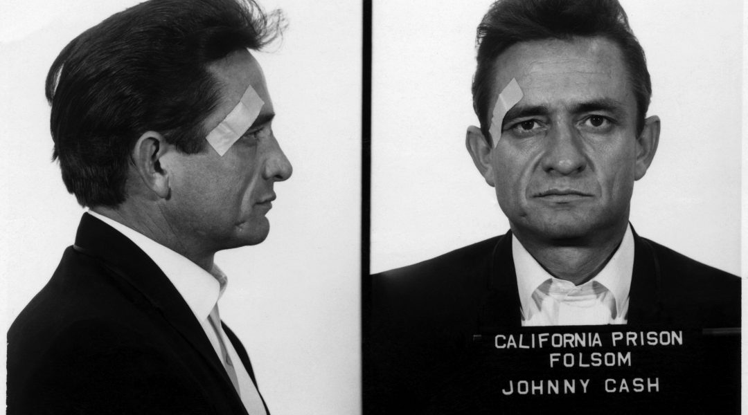 Cash as outlaw in a parody mugshot taken around the time of ”Folsom Prison Blues.”