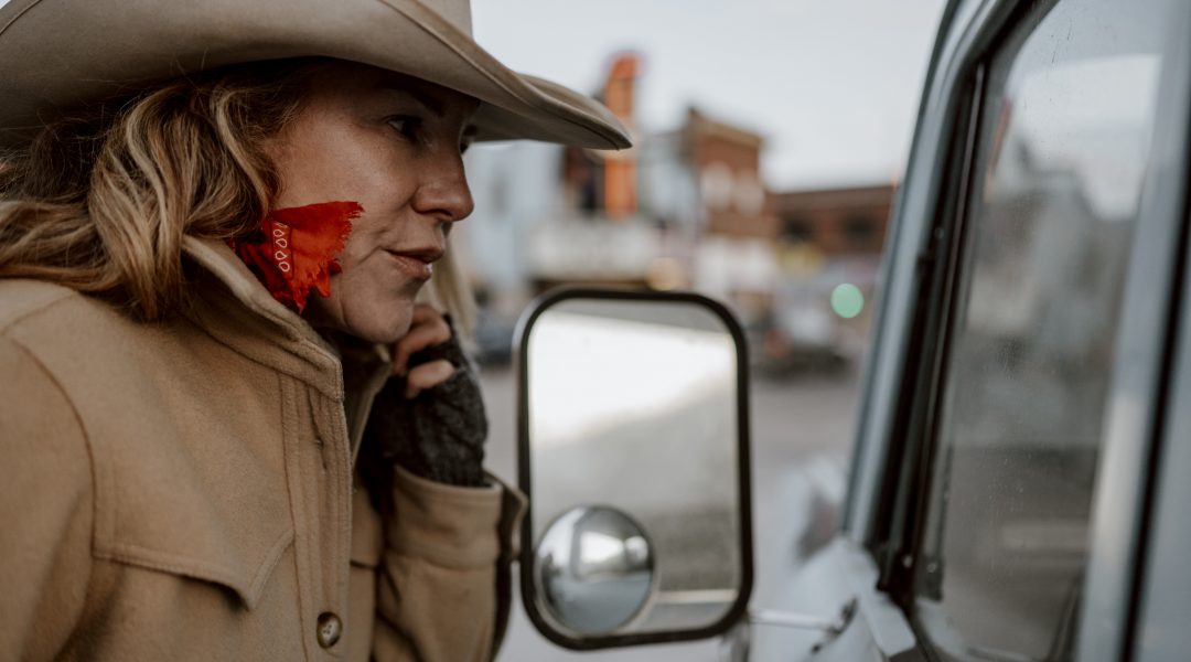 High-quality, American-made: Tuohy cruising downtown Livingston, Montana, in her 1973 International Harvester pickup and The Darrell jacket — an automotive heirloom and an apparel heirloom-in-the making.